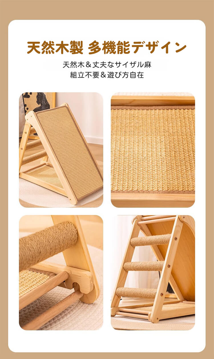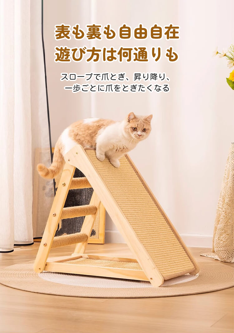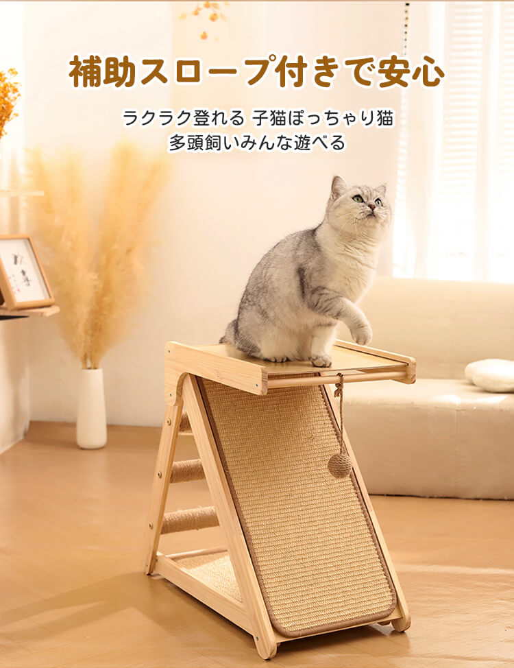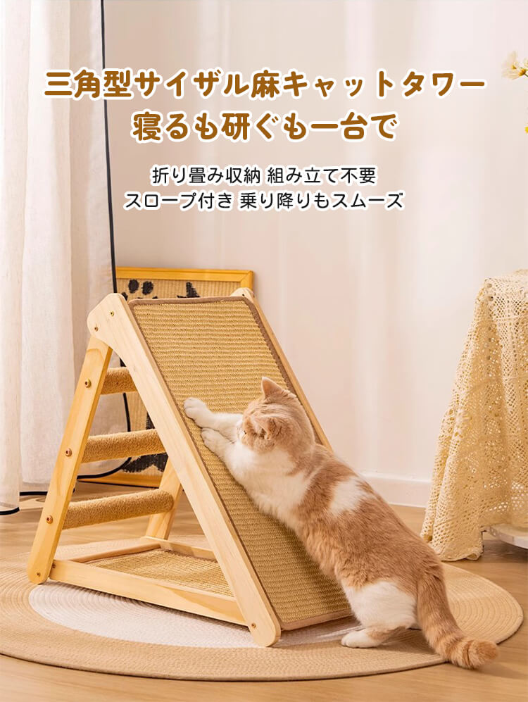 【100件限定】1点ご購入につき1点プレゼント!折りたたみ式猫用爪とぎタワー 天然木製 組み立て不要 多機能 3面使える コンパクト収納 安定感抜群 三角構造 スロープ付き 全年齢・多頭飼い対応 子猫 ぽっちゃり猫も安心 麻縄 サイザル麻 高密度 爪とぎ ストレッチ 遊び場 寝床 一台多役