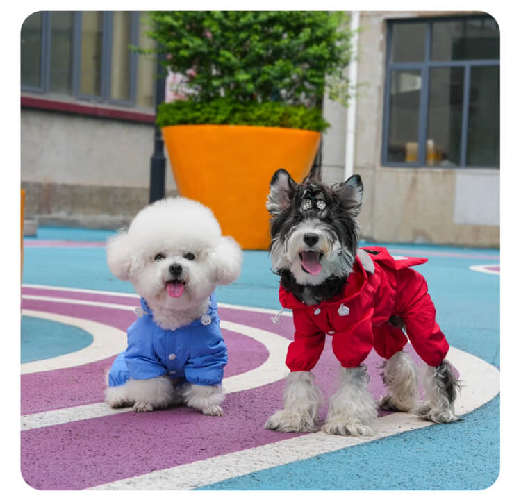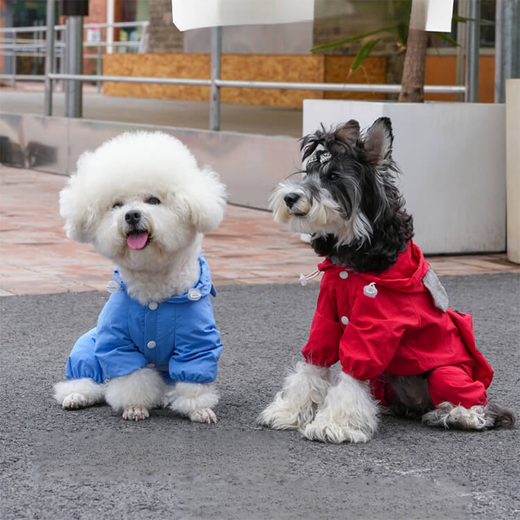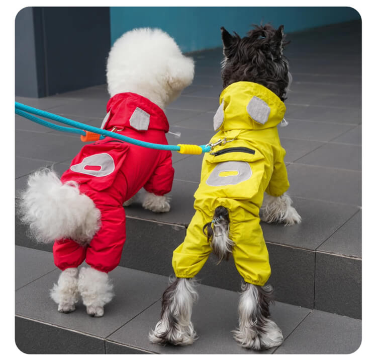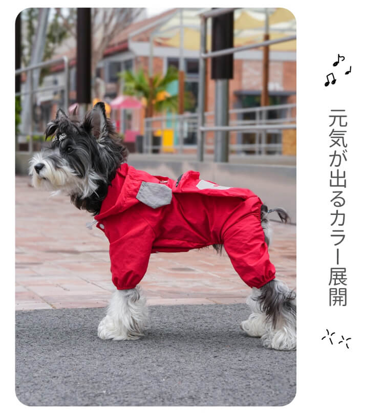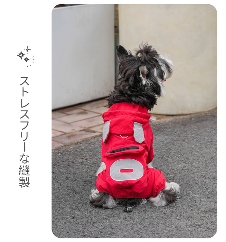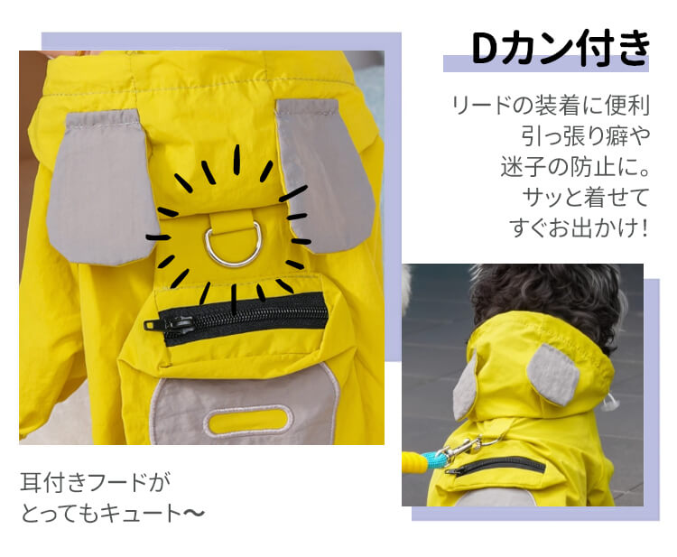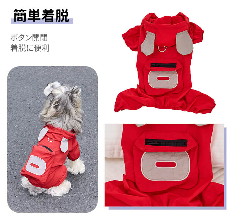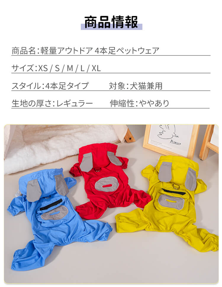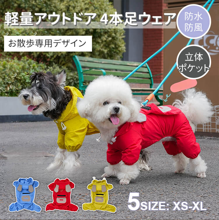 犬用レインウェア 4本足 軽量アウトドアウェア オールシーズン対応 防風 防水 防汚 ドッグウェア 一体型ハーネスDカン付き ミニポケット 着脱簡単 伸縮性袖口 耳付きフード付き 小型犬 中型犬 大型犬 寒さ対策 梅雨対策 汚れ防止 花粉対策