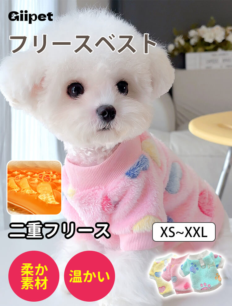 Giipetのフリースベストは、愛犬の秋冬のおしゃれと防寒を叶える人気アイテムです。ふわふわで柔らかい二重フリース素材が、肌触り良く暖かさをしっかりキープ。蓄熱効果で寒い日も快適に過ごせます。上品な襟元と肩幅で、うちの子にぴったりフィットする着心地。金属製Dリング付きでリード装着も簡単、お散歩も安心安全です。多くの飼い主様から「期待以上」と絶賛される、デザインも品質も星5つのおすすめ商品です。