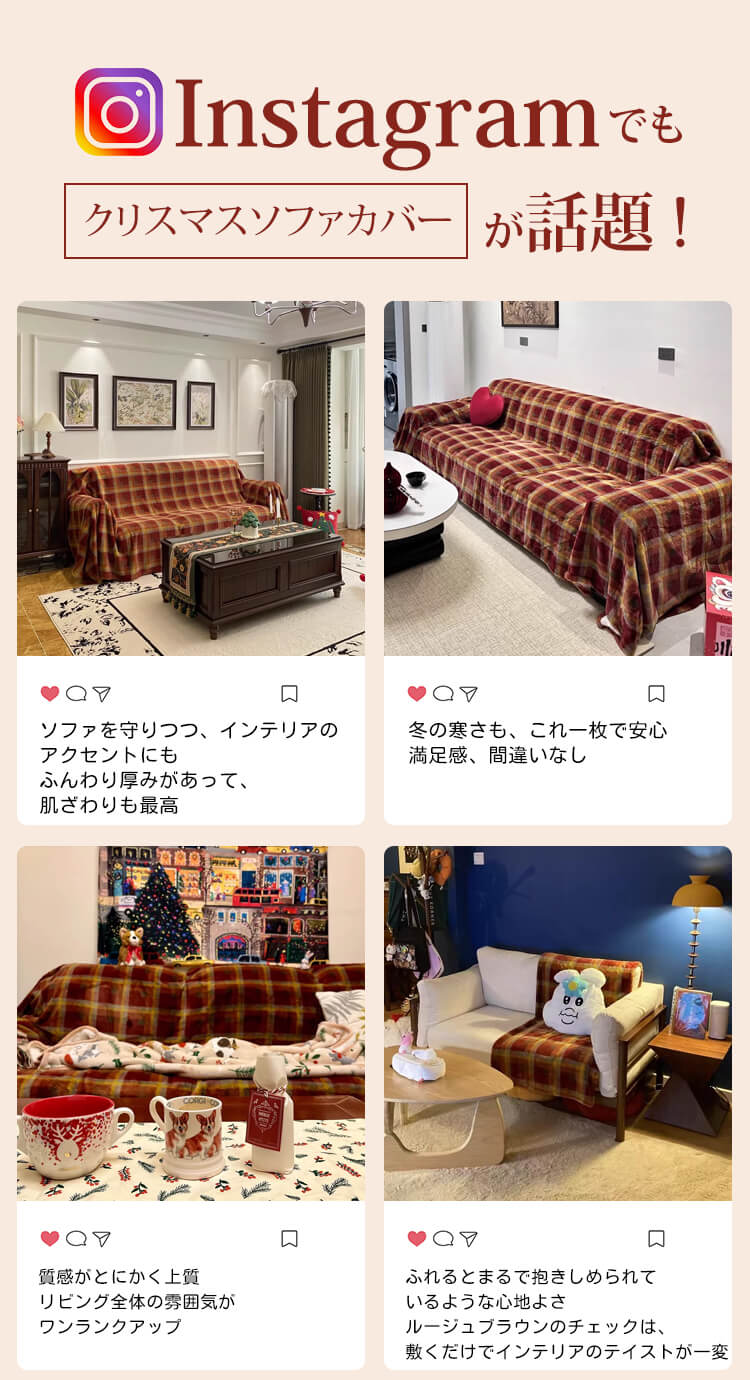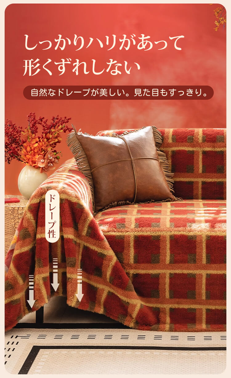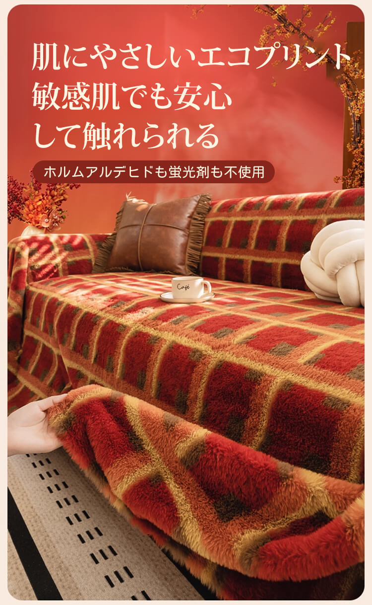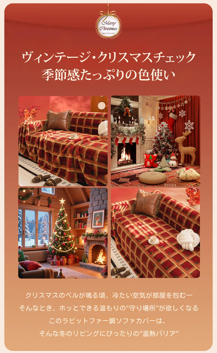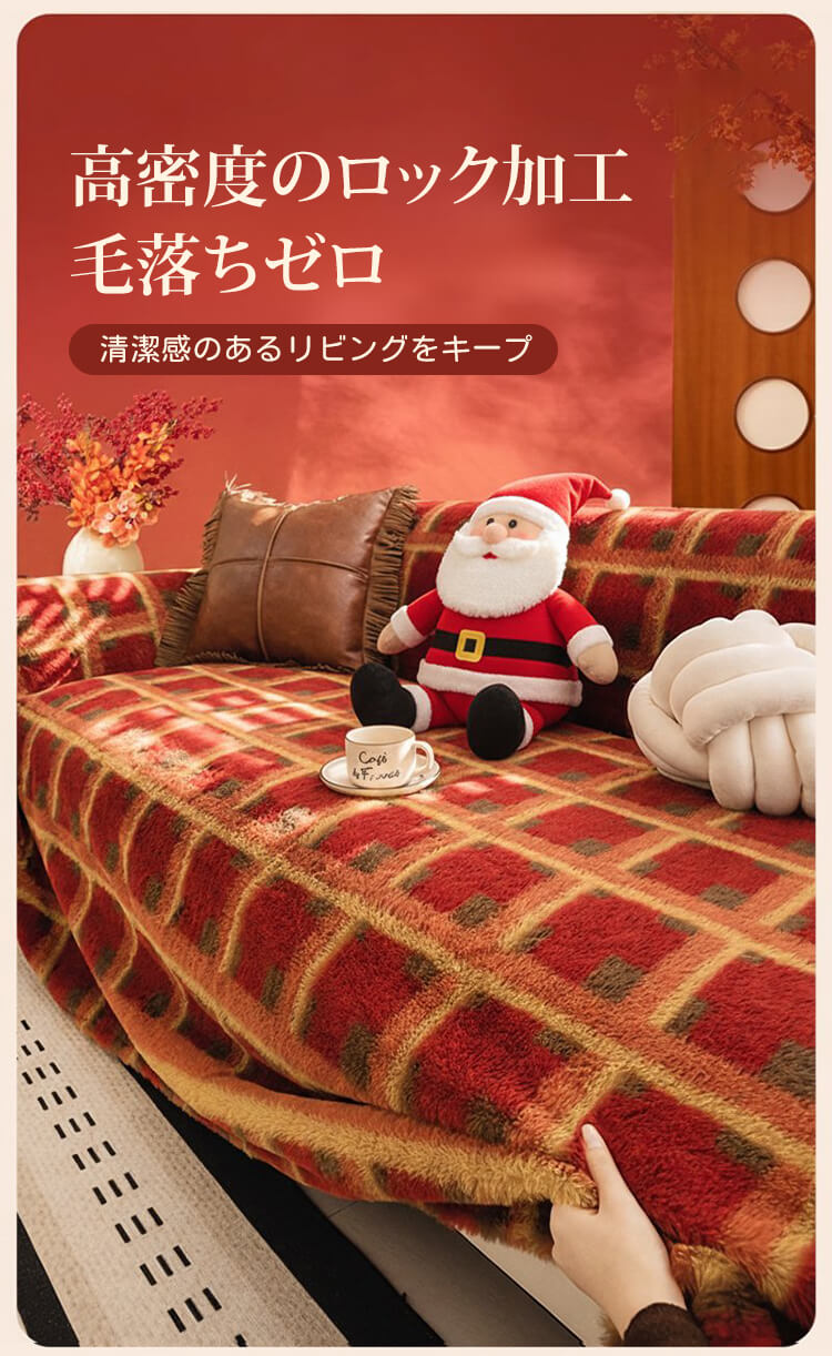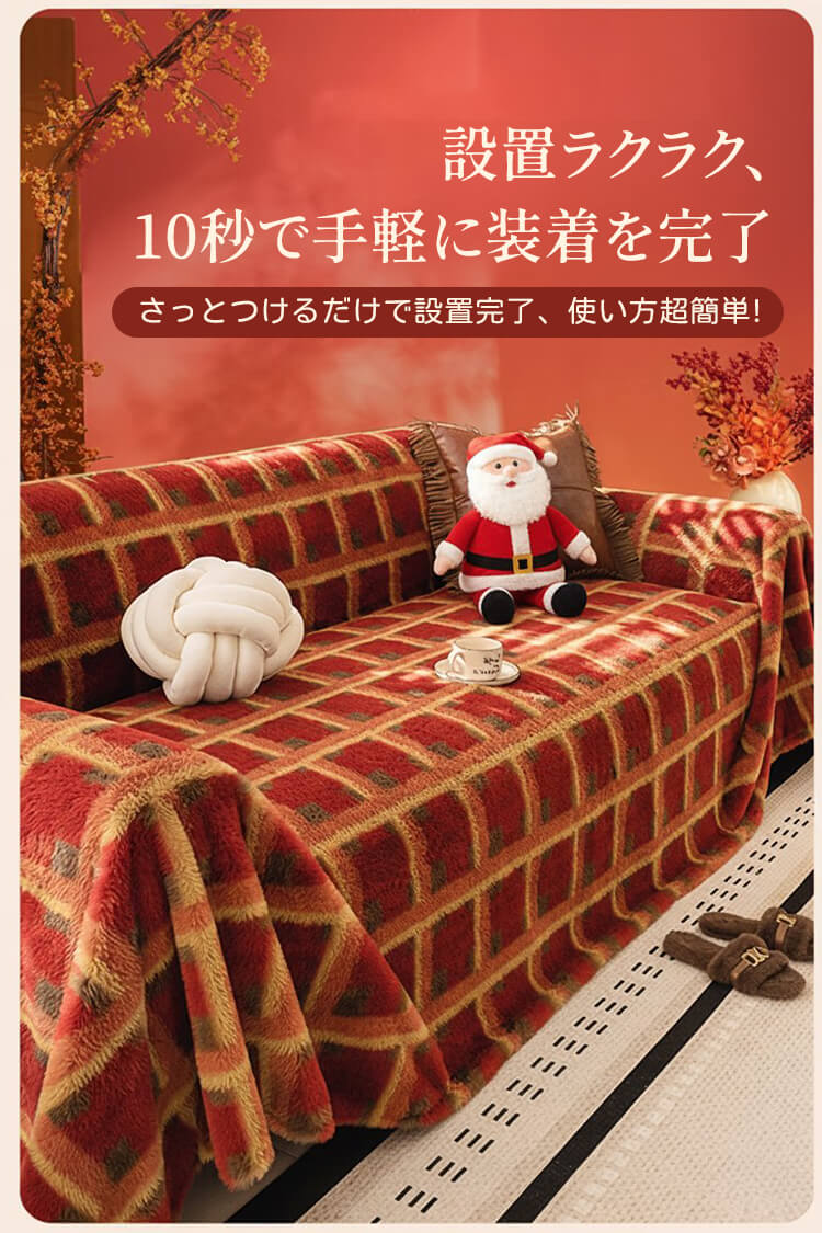 秋冬用 クリスマスチェック柄 ソファカバー ラビットファー調 なめらか肌触り ふわふわ 保温 軽量 厚手 高品質シェニール マルチカバー リビングインテリア 防汚 ズレ防止 おしゃれ 季節感たっぷり