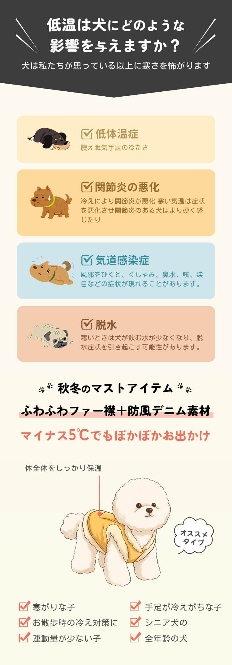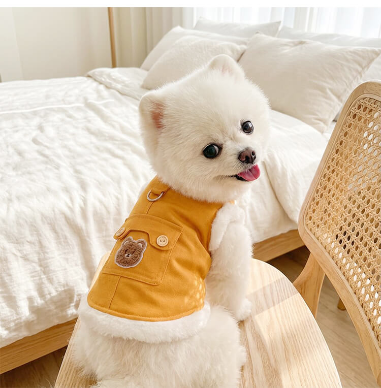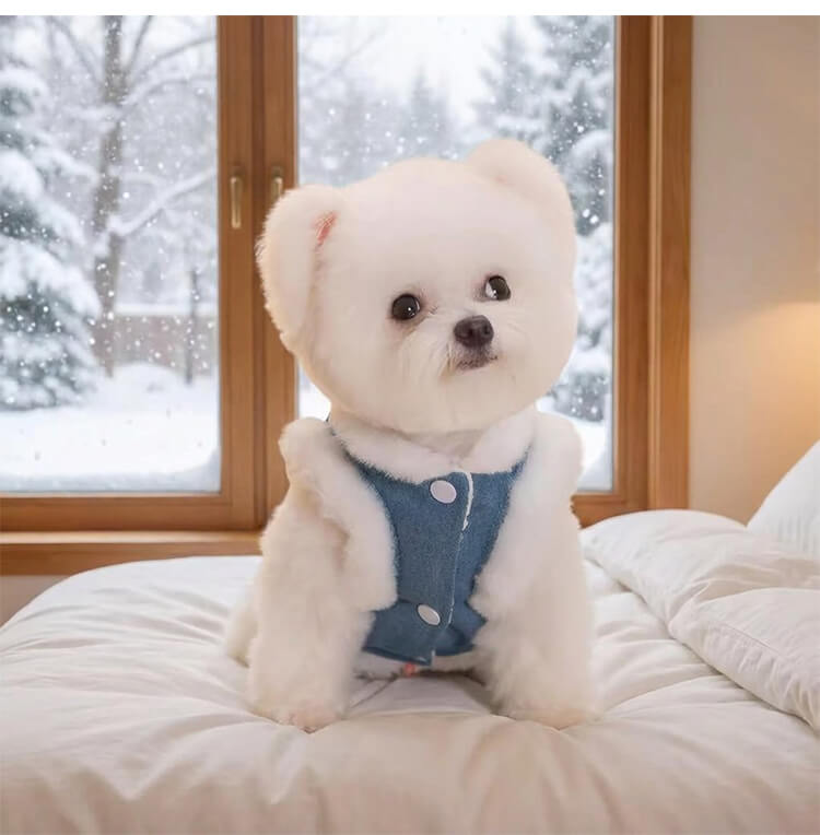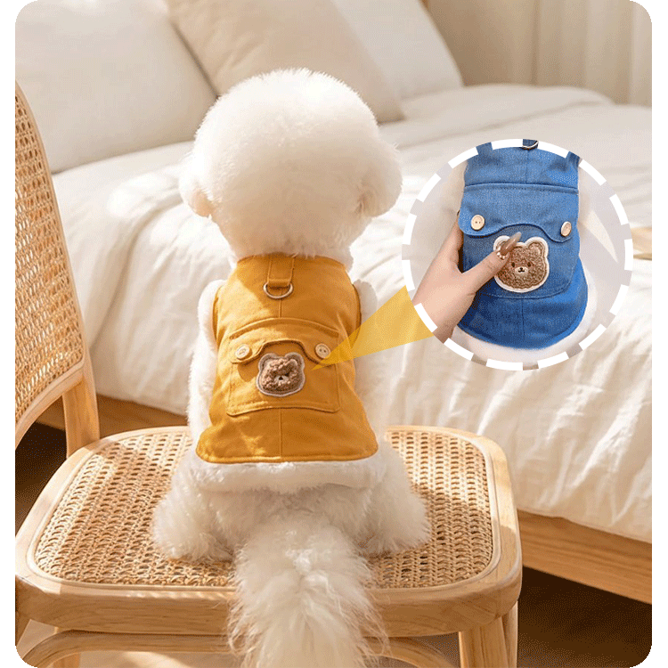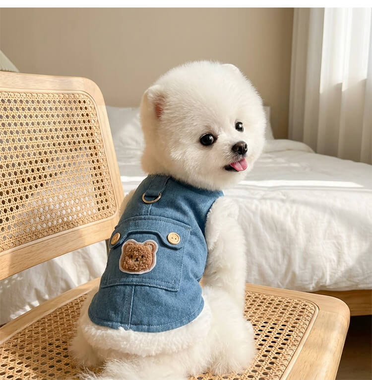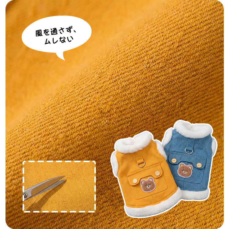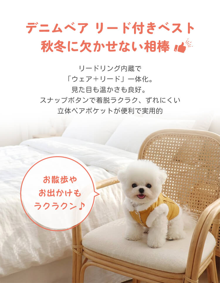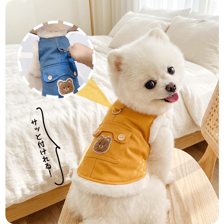 犬服 リード一体型デニムベスト 防寒着 マイナス5℃対応 360°保温 ふわふわファー裏地 高密度フリース スナップボタン 着脱簡単 動きやすい 暖かくてムレない 耐久性 立体ベアポケット おしゃれ ドッグウェア 小型犬 中型犬 お散歩 マストアイテム 寒さ対策