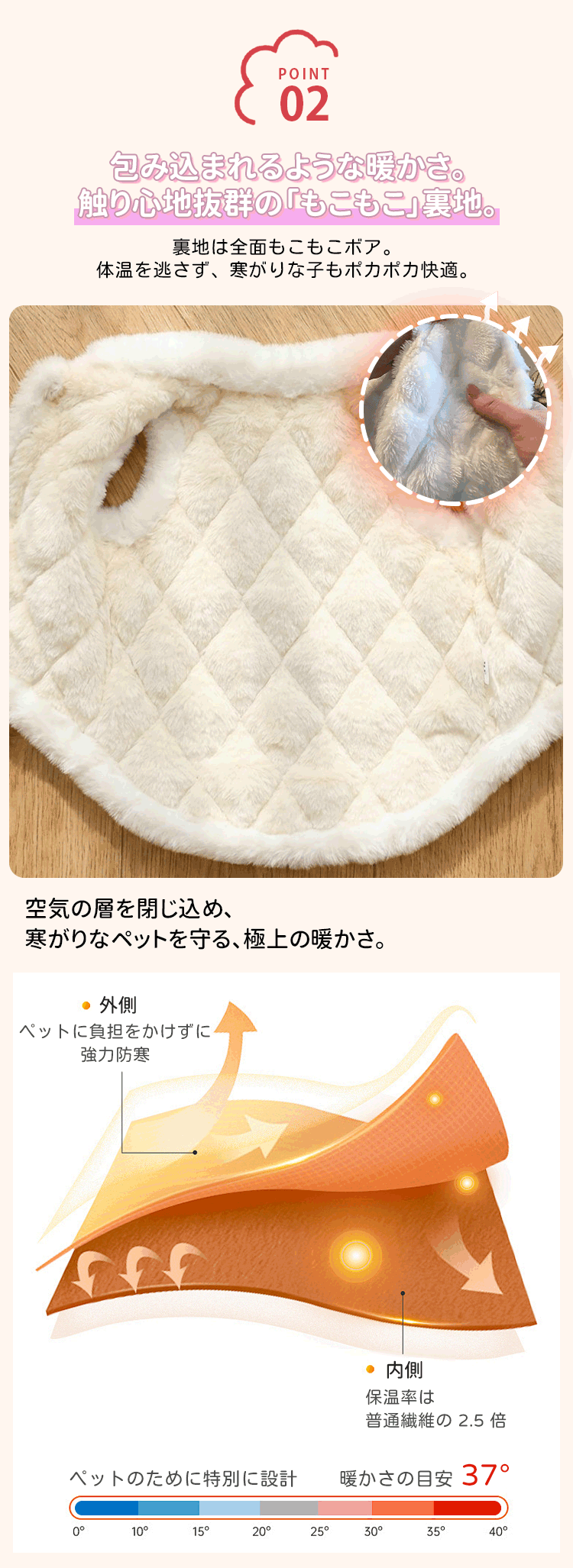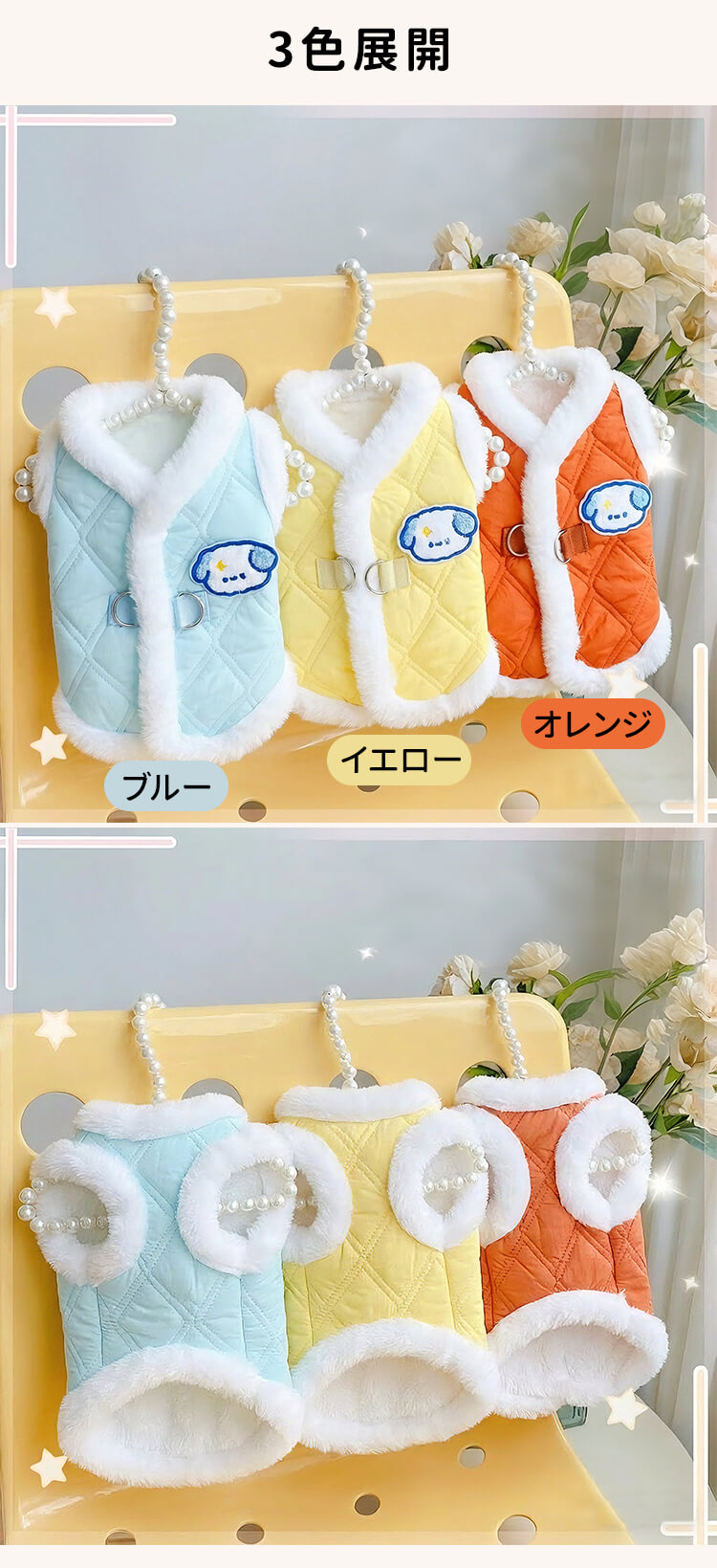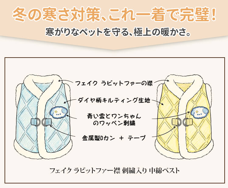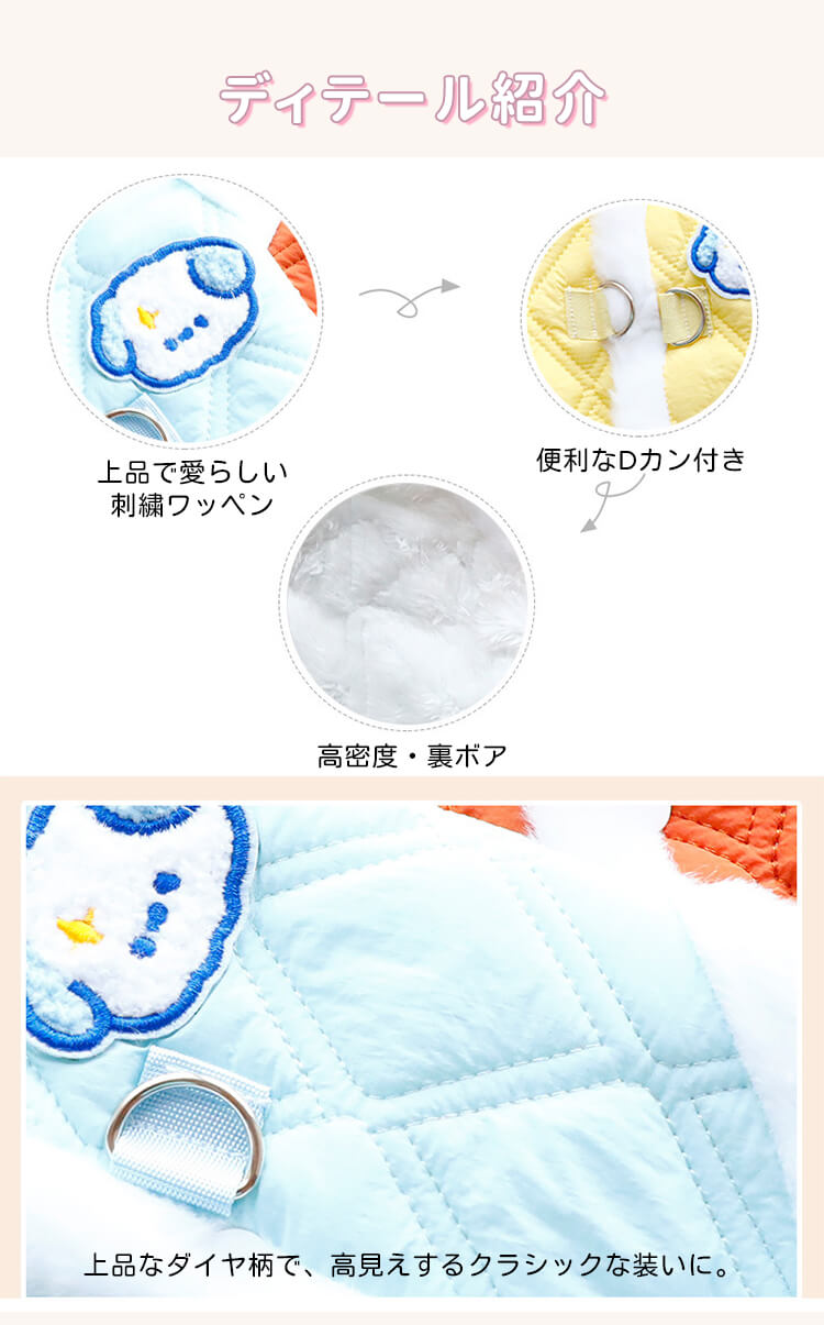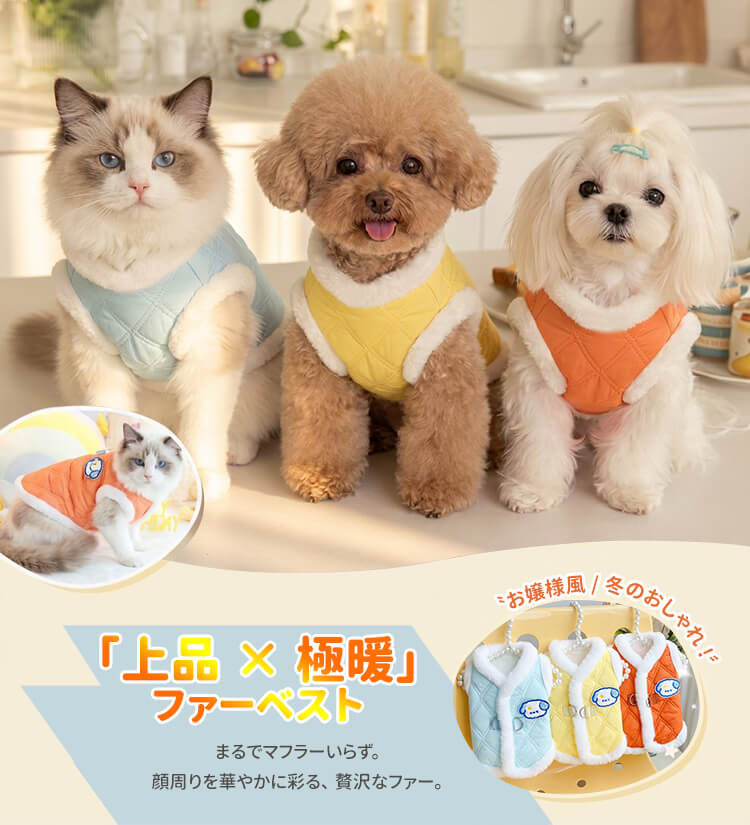 フェイクファー襟付き 極暖 キルティング ベスト 犬服 秋冬 防寒 保温 裏ボア もこもこ ハーネス一体型 Dカン付き 前開きボタン 着脱簡単 上品 ダイヤ柄コート 小中型犬 猫兼用 寒さ対策