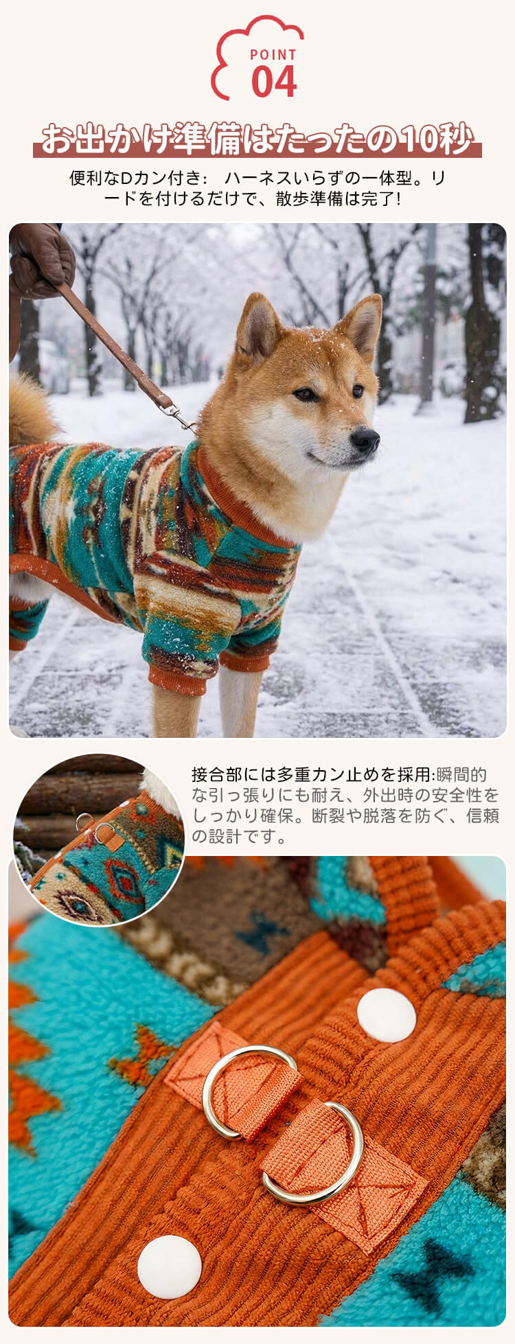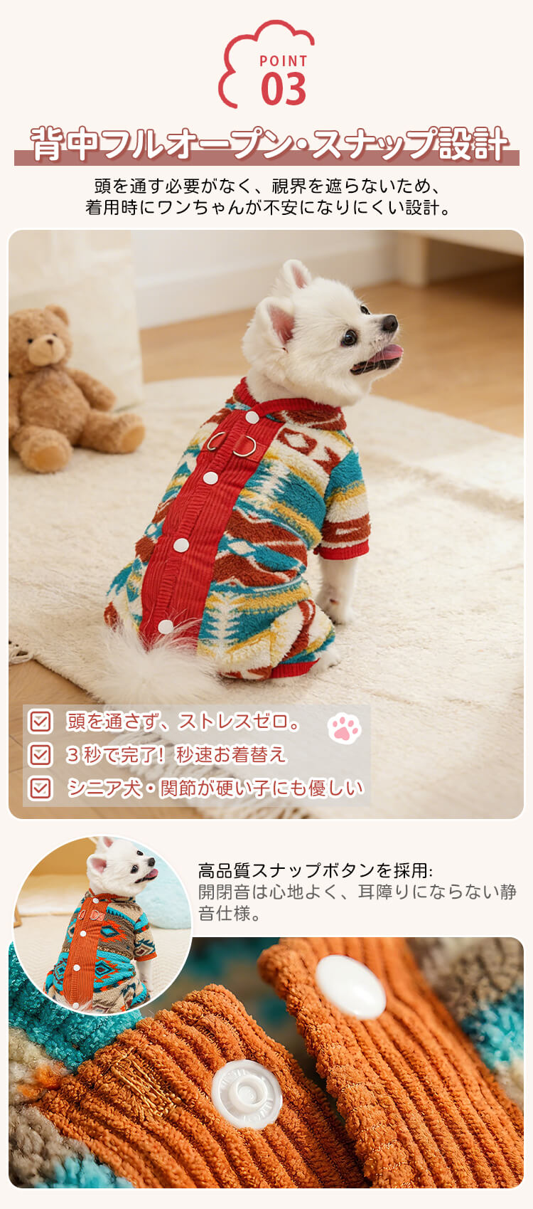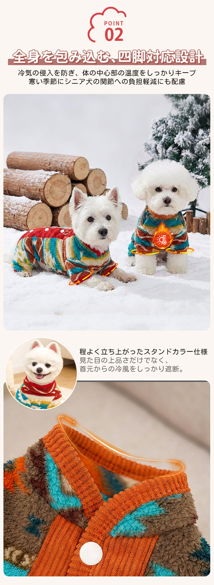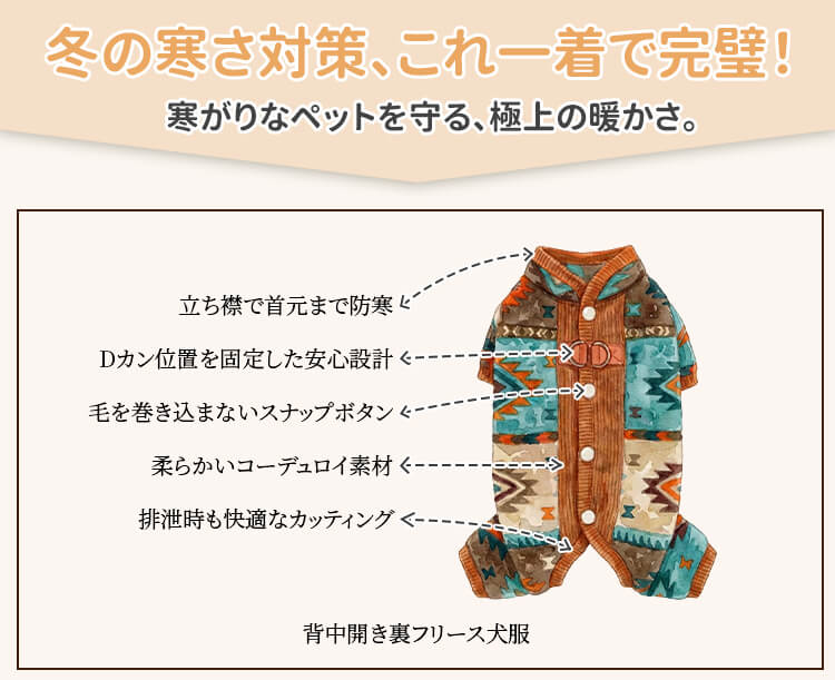 背中開き裏フリース犬服 ドッグウェア 冬用 防寒保温 ラムファー コーデュロイ 厚手 着たままトイレOK 着脱簡単 リードDカン付き 四脚対応 首元防寒 洗濯機OK 多頭飼い 写真映え シニア犬にも