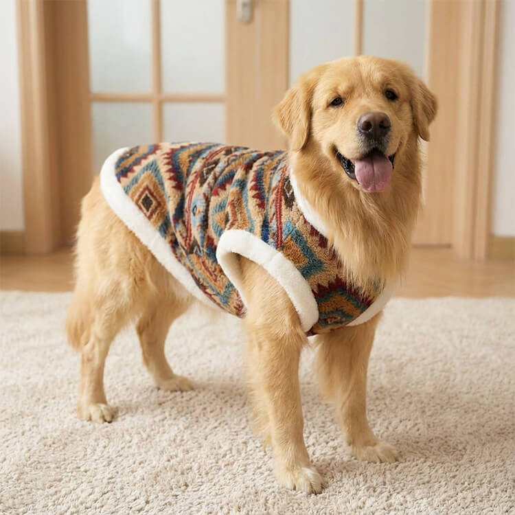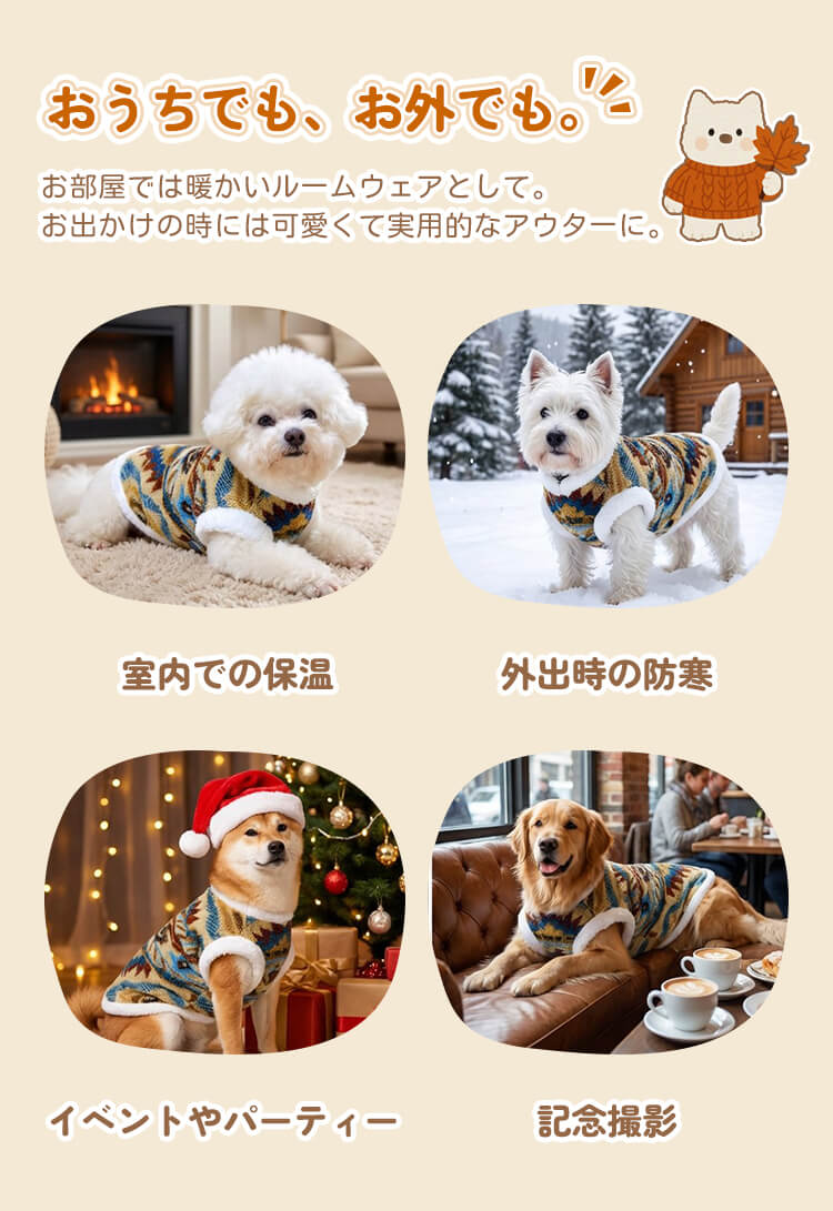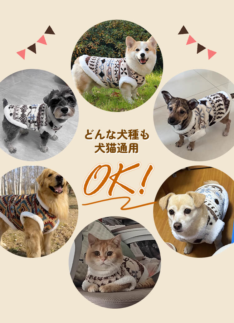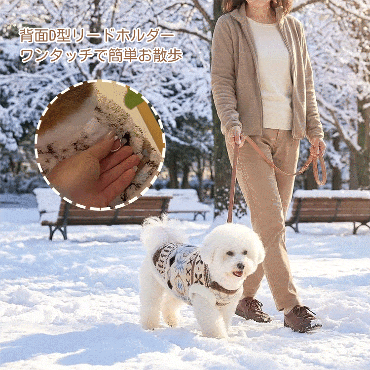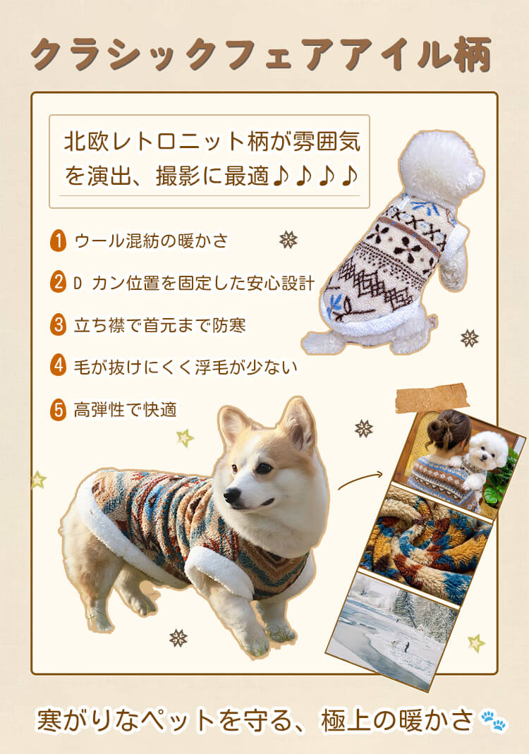 ペット用フェアアイル柄防寒コート 羊毛入り裏起毛 ドッグウェア 北欧レトロ ニット風 強力保温 伸縮性抜群 マイナス5℃対応 着たままトイレOK Dカン付きリード留め 洗濯機OK XS-9XL 小型犬 中型犬 大型犬 超大型犬 寒さ対策