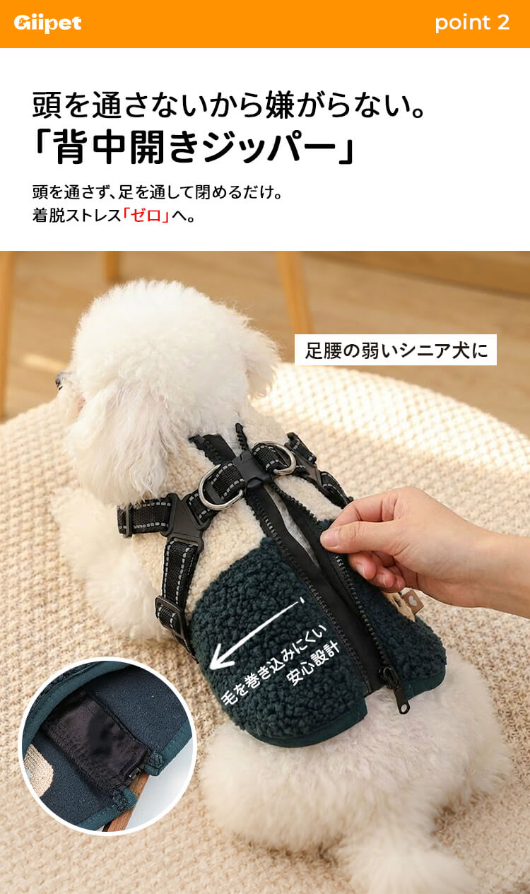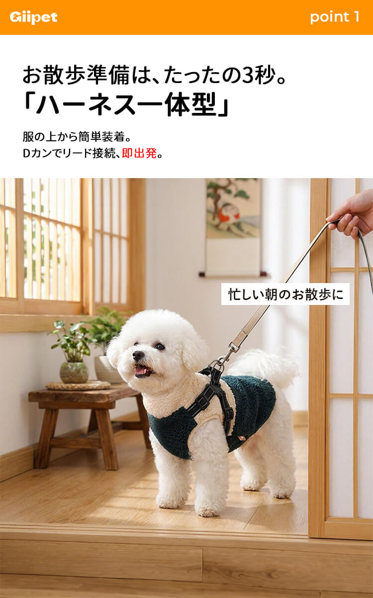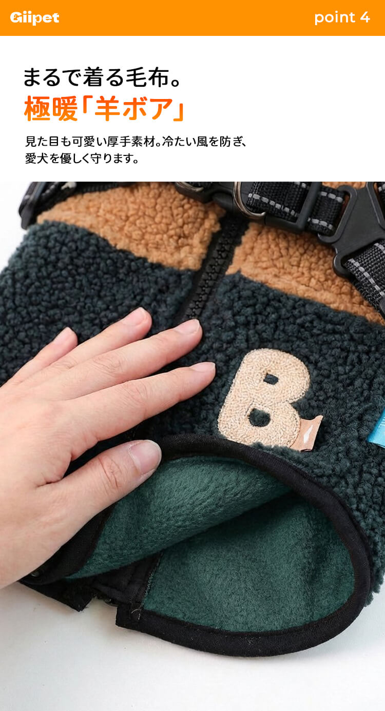 ハーネス一体型ドッグウェア 冬用 極暖シープボア 裏フリース 犬服 着る毛布 防寒保温 寒さ対策 スタンドネック 背中開きジッパー 3秒装着 頭を通さない ストレスゼロ 着脱簡単 ダブルDカン 反射材 夜道も安心 脱げにくい 上質刺繍 高級感 写真映え 丸洗いOK 洗濯機対応 小型犬 中型犬 大型犬