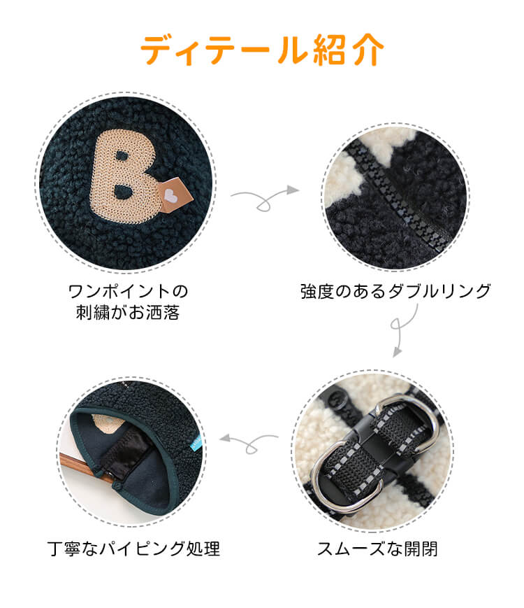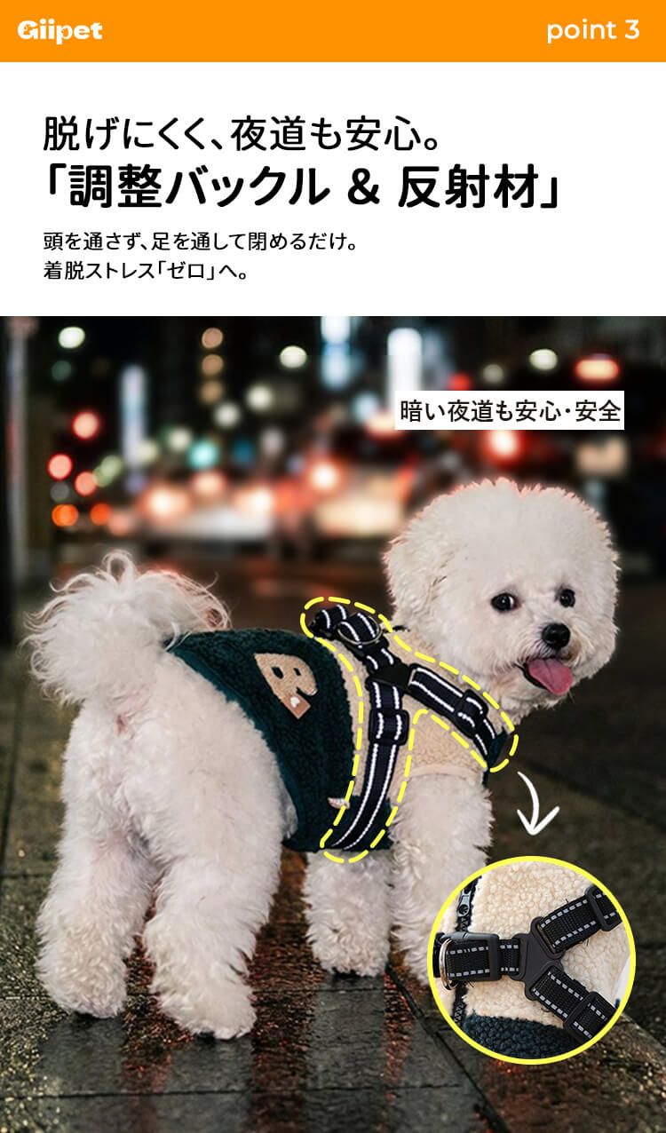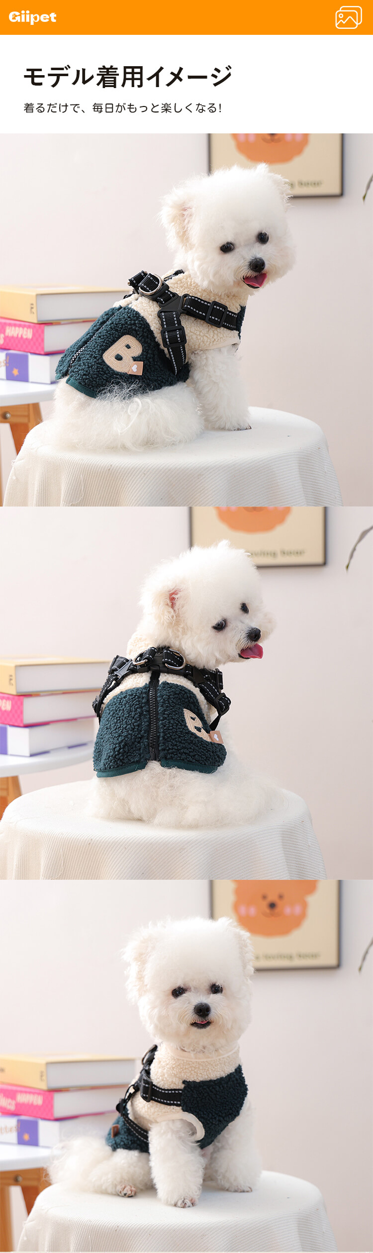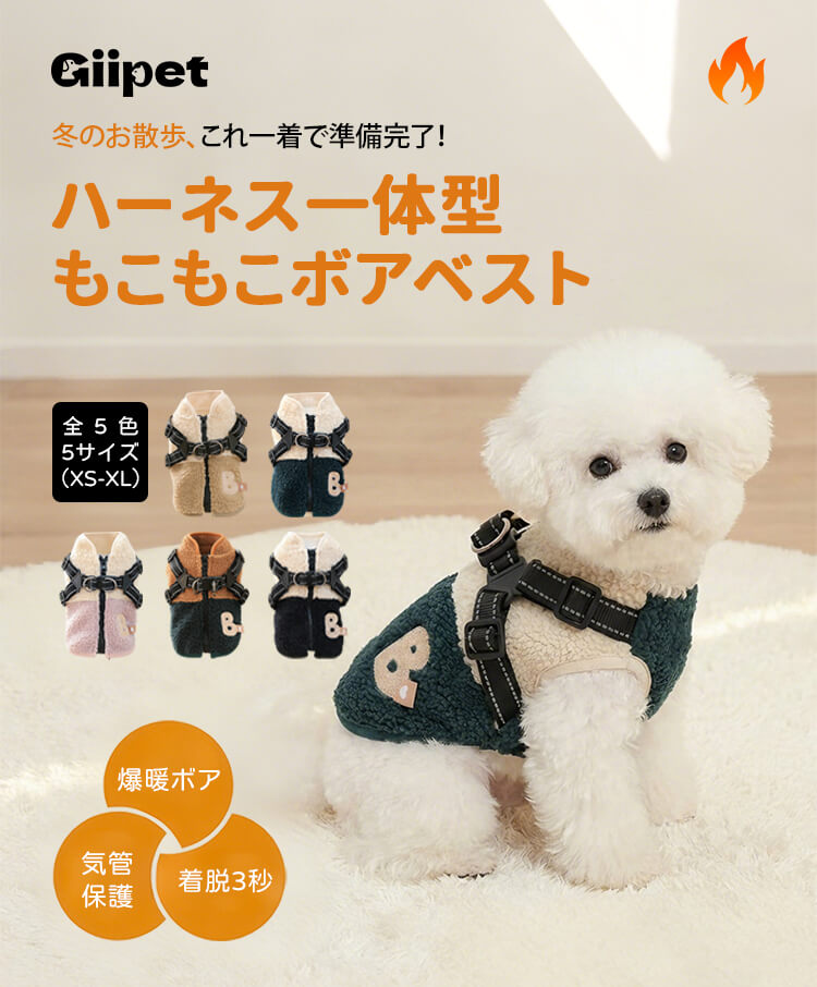 ハーネス一体型ドッグウェア 冬用 極暖シープボア 裏フリース 犬服 着る毛布 防寒保温 寒さ対策 スタンドネック 背中開きジッパー 3秒装着 頭を通さない ストレスゼロ 着脱簡単 ダブルDカン 反射材 夜道も安心 脱げにくい 上質刺繍 高級感 写真映え 丸洗いOK 洗濯機対応 小型犬 中型犬 大型犬