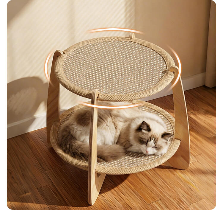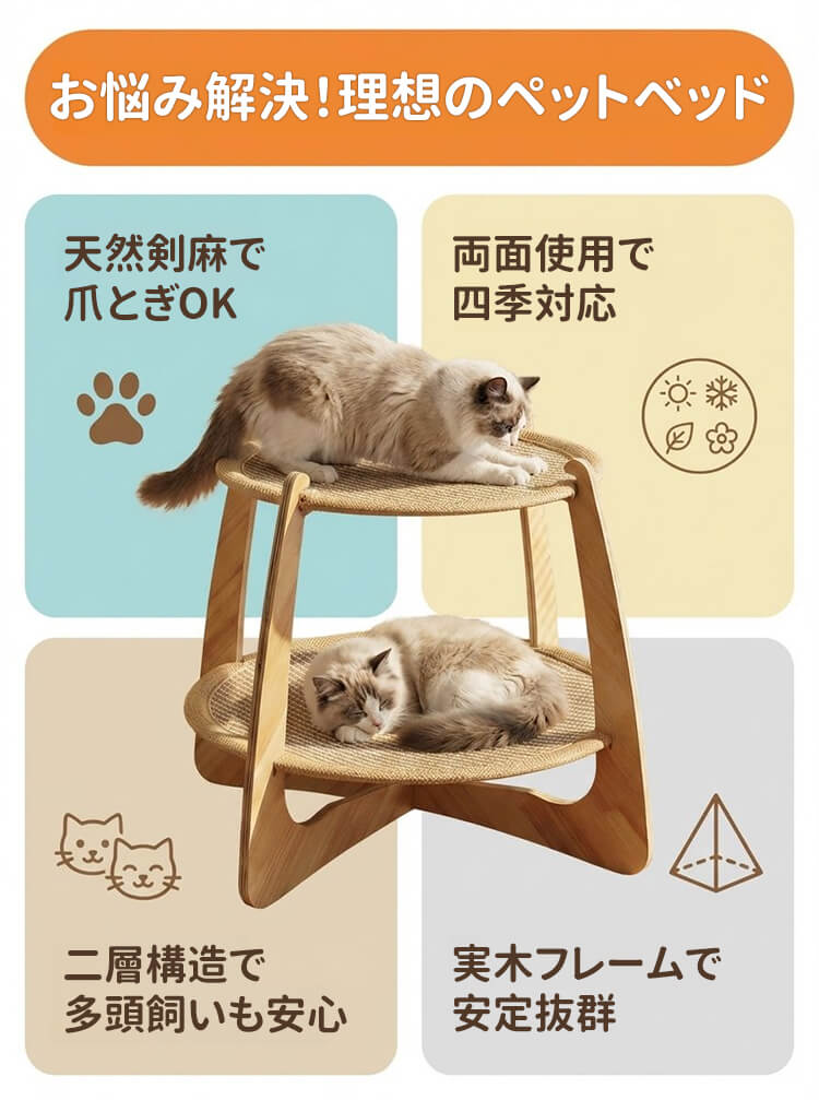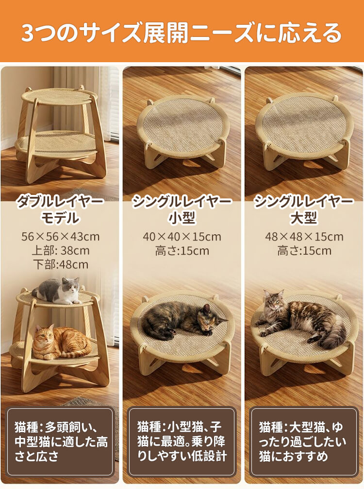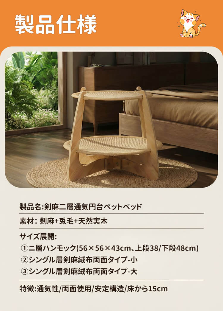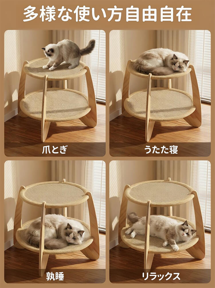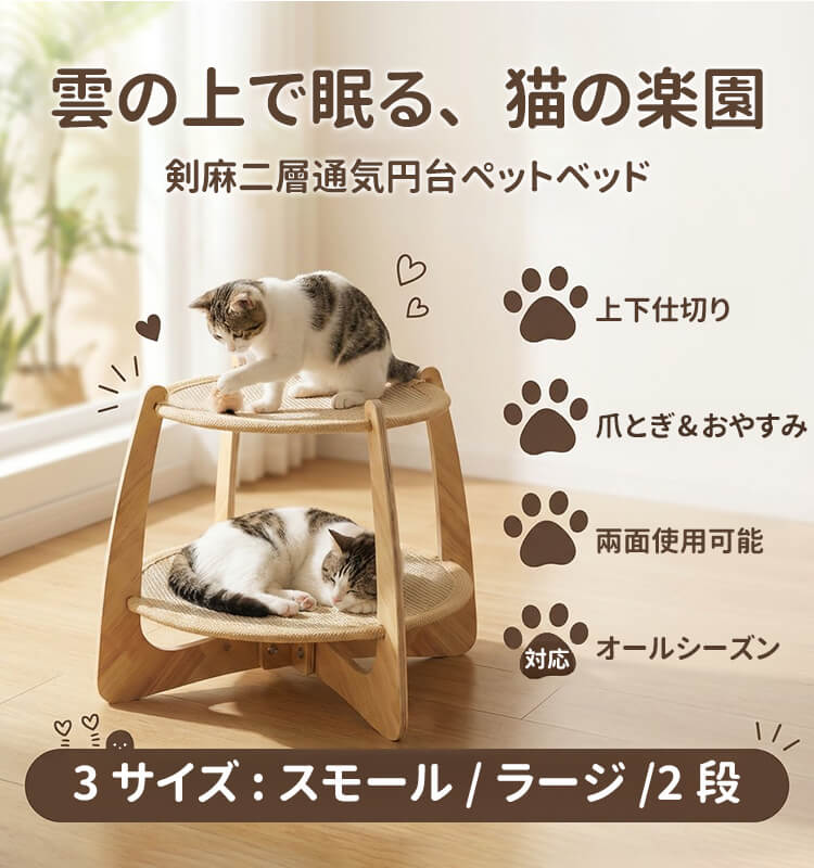 円台ペットベッド 剣麻二層通気 猫 爪とぎ 二段ベッド 木製 天然サイザル麻 通気性抜群 四季通用 両面使用 おやすみ 安定性 多头饲い対応 頑丈 おしゃれ インテリア 3サイズ展开 スモール/ラージ/2段