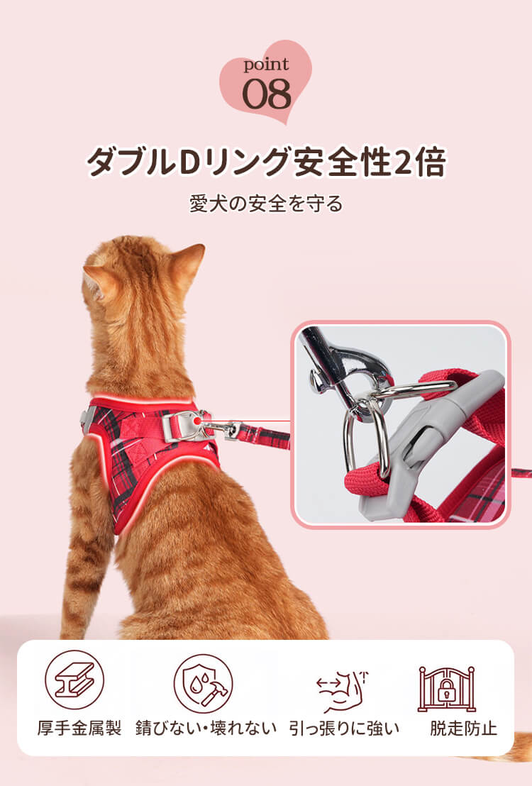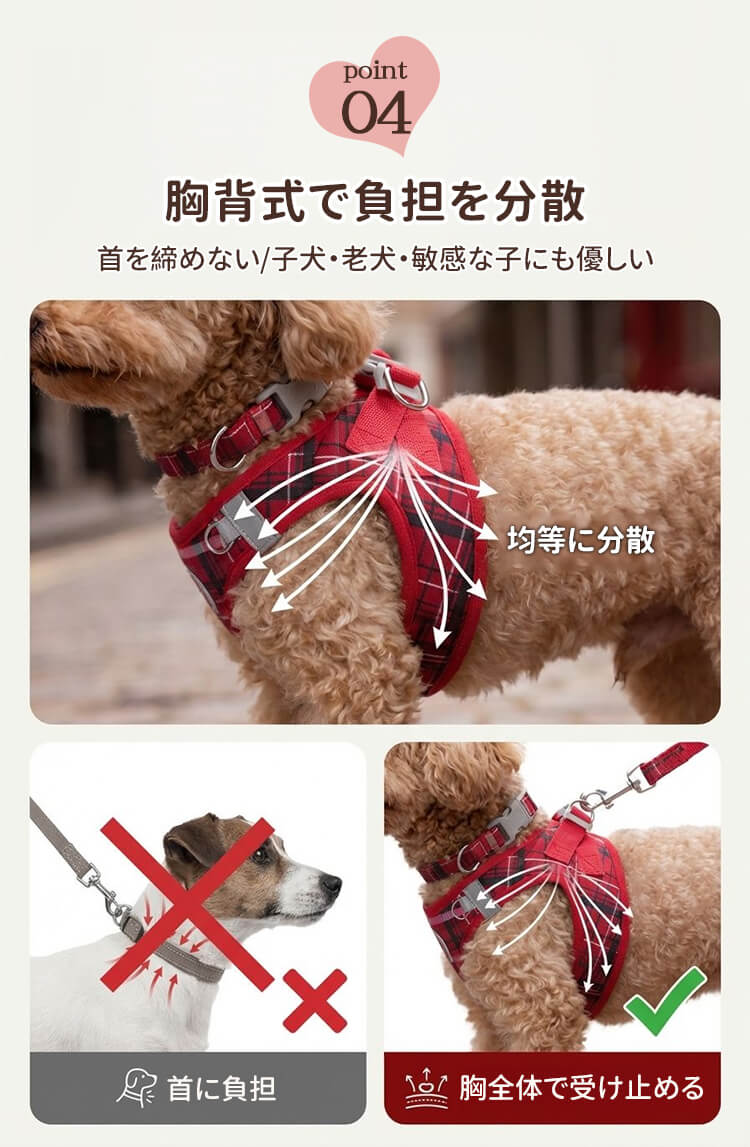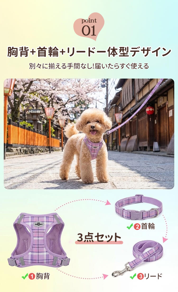 ソフトメッシュチェックハーネス 首轮 3点セット インスタ风 通気性 反射材付き 夜间安全 衝撃分散 ベルクロ调整 抜けにくい 小型犬 中型犬 猫 1.5-14kg対応 お散歩 お出かけ