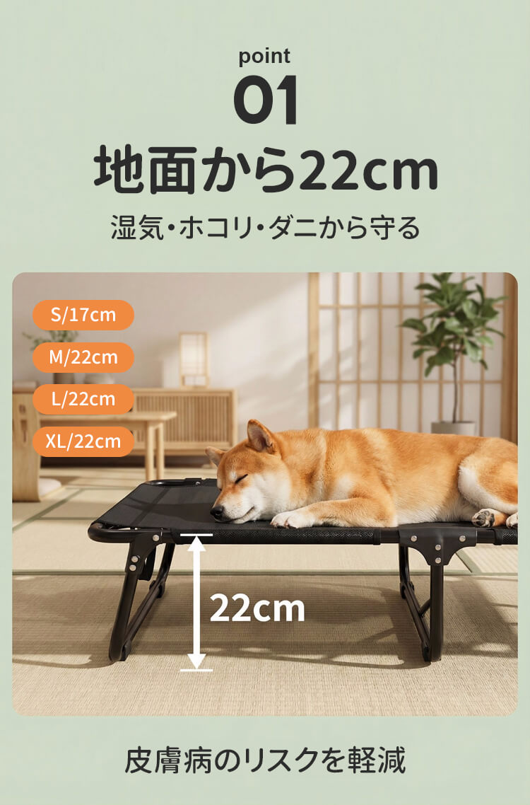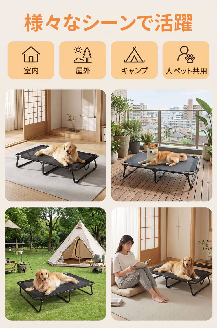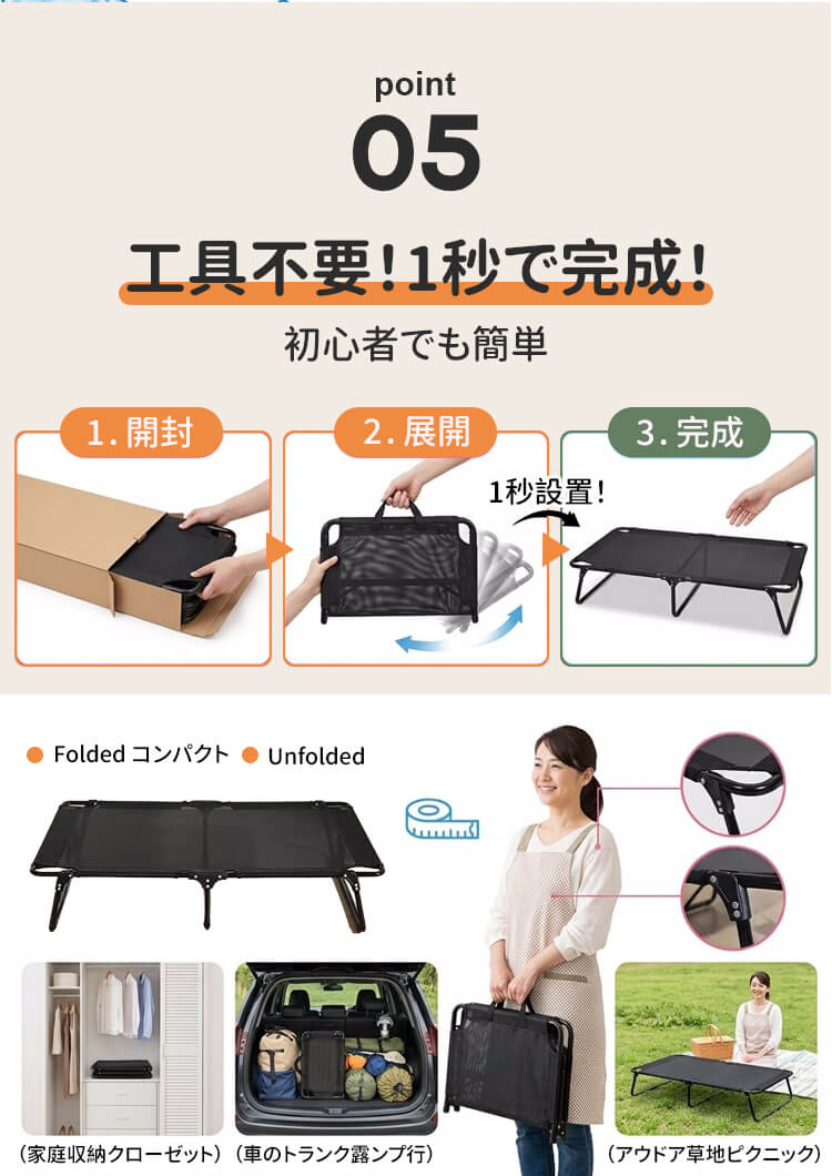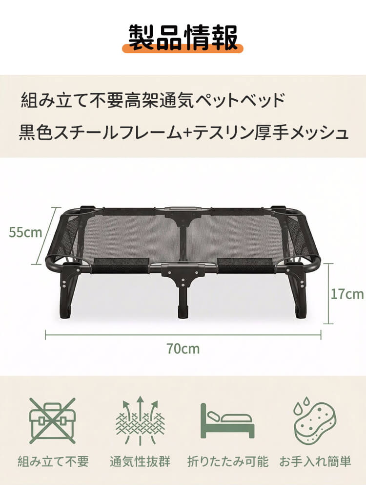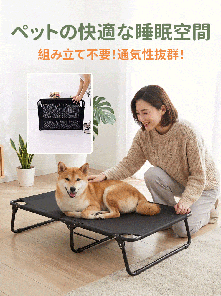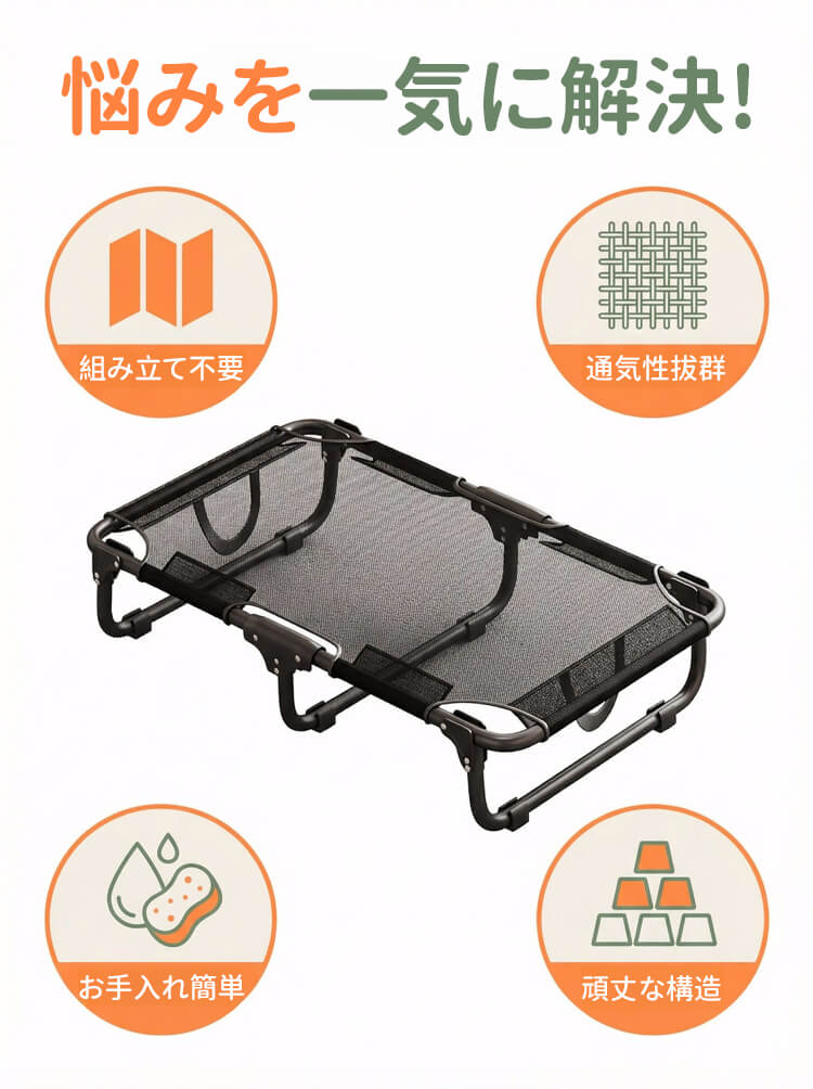 脚付きペットベッド 組み立て不要 コット メッシュ 犬 猫 完成品 高床式 通気性抜群 蒸れない 涼しい 夏用 湿気対策 地面離れ 洗える 頑丈 室内 屋外 アウトドア キャンプ オールシーズン 小 中型犬