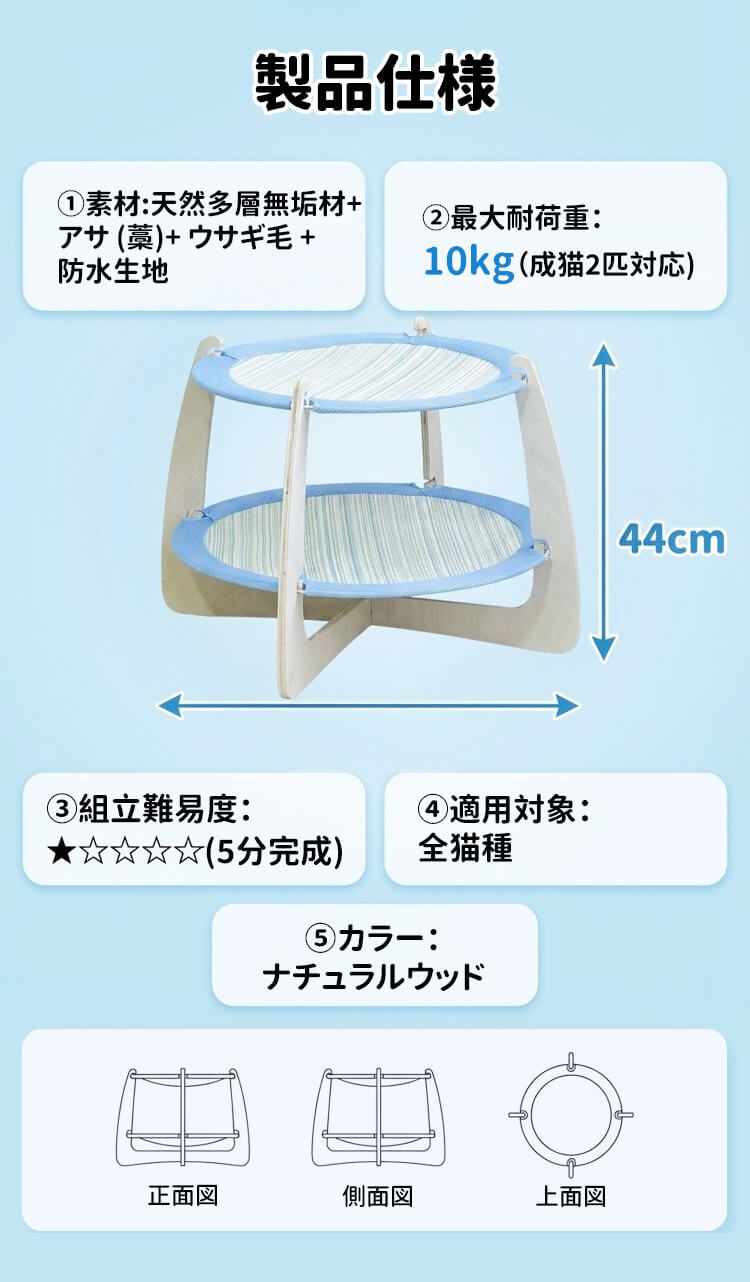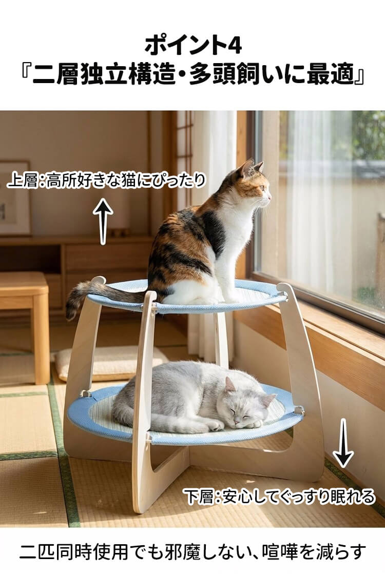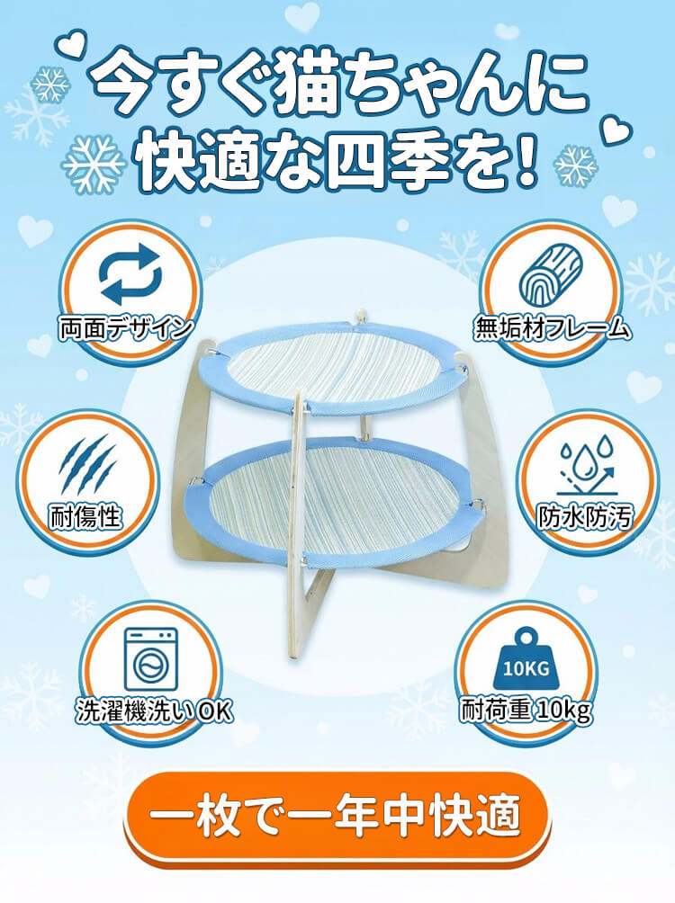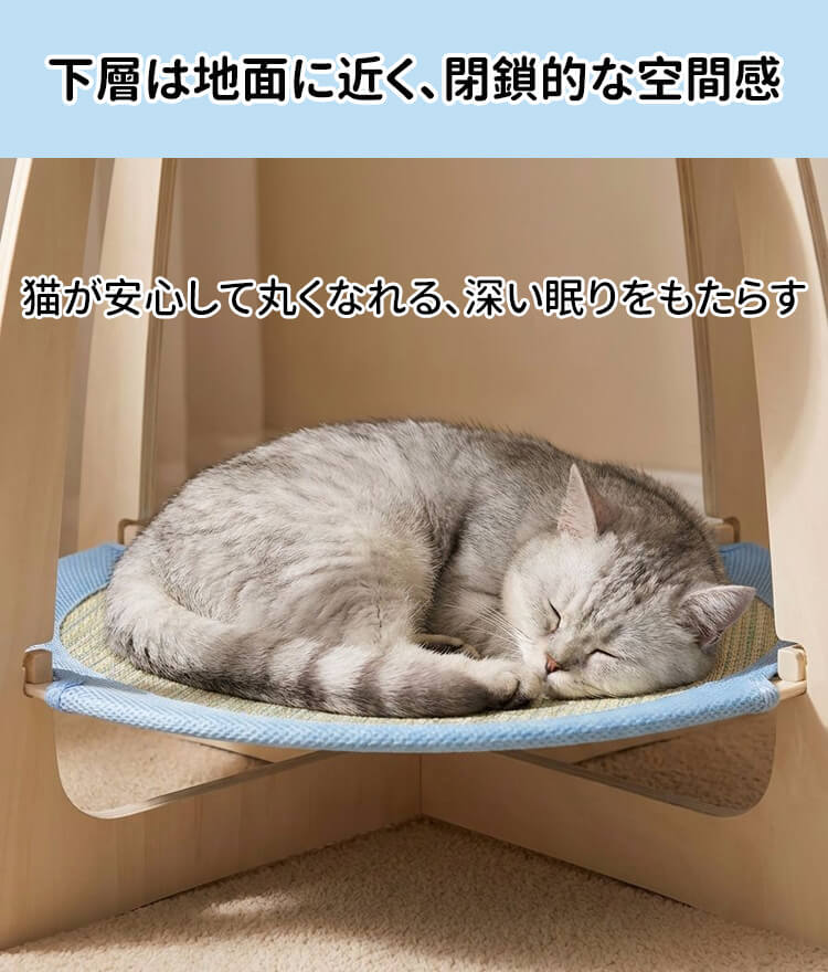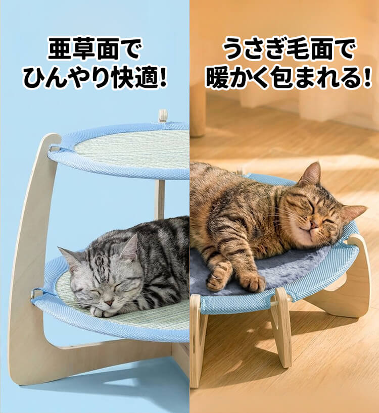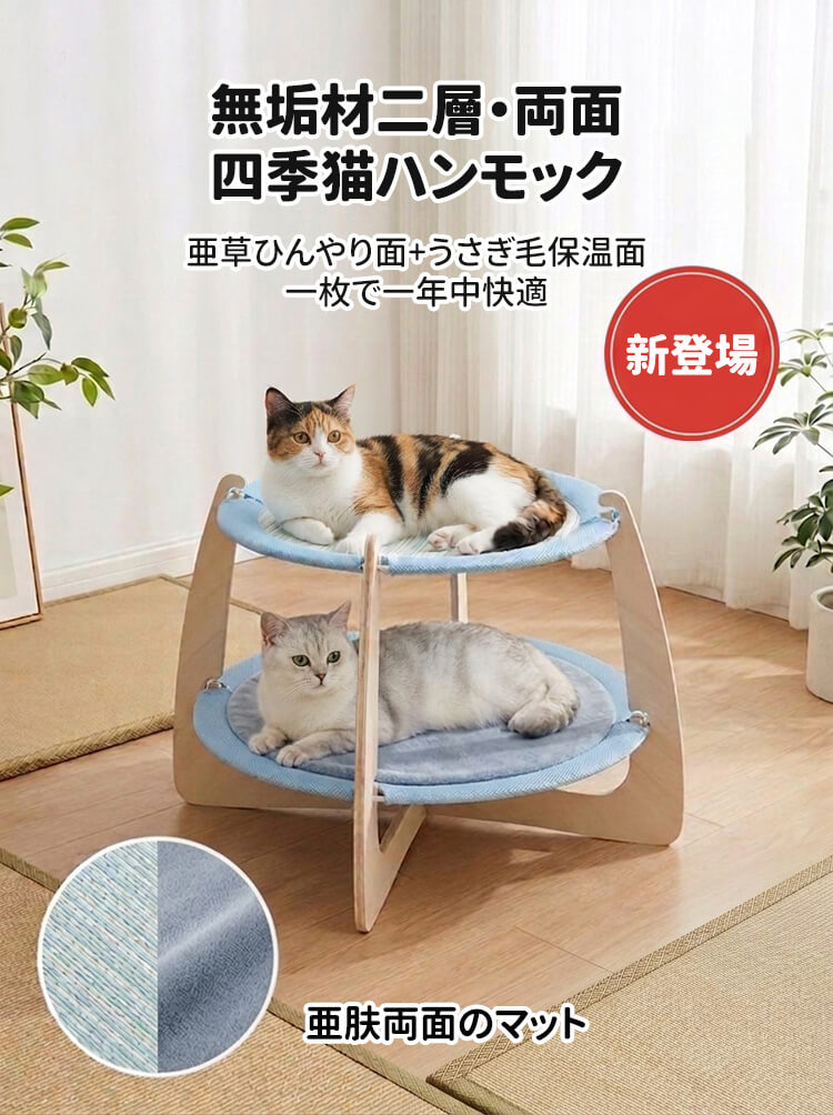 二層両面四季猫ハンモック 2段 木製 天然木 二層 独立空間 多頭飼いOK リバーシブル 亜麻 ひんやり 涼しい 四季通用 通気性抜群 頑丈 安定感 お手入れ簡単 室内用